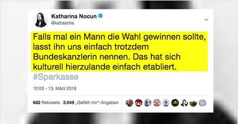 BuzzFeedNews hat 16 witzige Tweets veröffentlich, die sich sarkastisch über das BGH-Urteil gegen Marlies Krämer, das daran festhält, dass die Sparkassen ihre Kundinnen in ihren Formularen weiterhin mit „Kunde“ ansprechen dürfen. Das mache man ja schon seit 200 Jahren so und Frauen wüssten ja dass sie „mitgemeint“ sind.