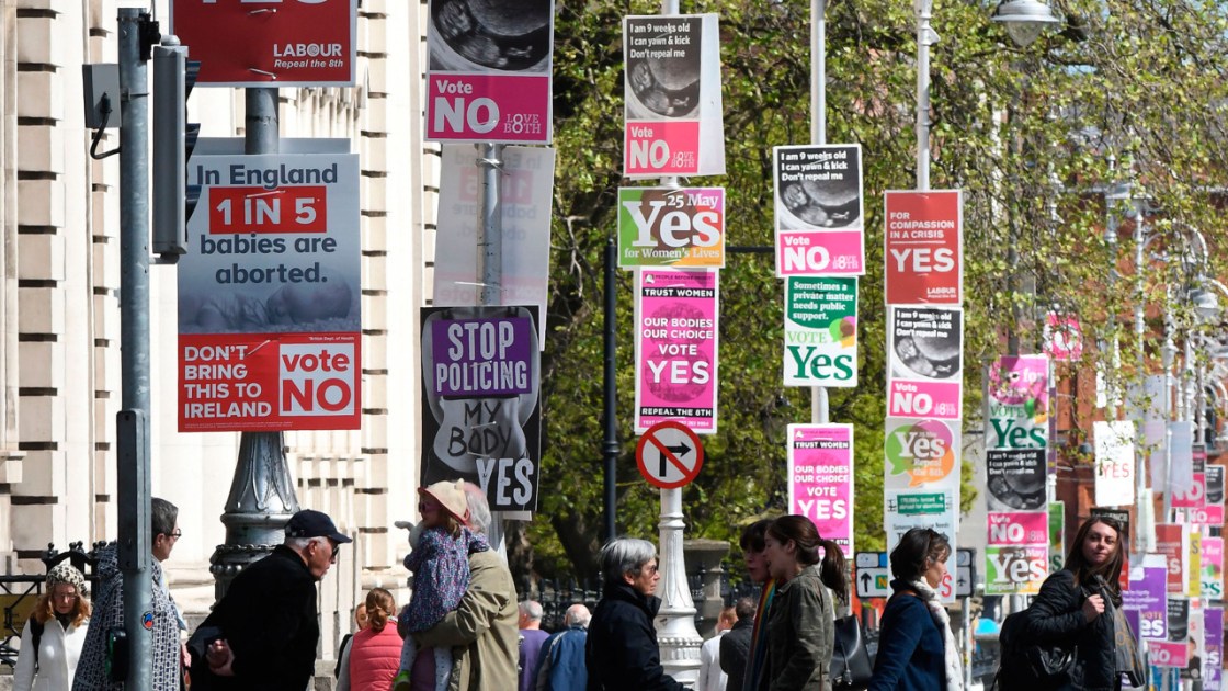 Das Land ist unterdessen mit Plakaten zugehängt. „Mitgefühl und Respekt“ oder auch „Manchmal braucht es für eine private Sache öffentliche Unterstützung“ steht auf den Postern der Yes-Kampagne. Auf den Postern der No-Kampagne sind Ultraschallbilder von Ungeborenen zu sehen, darunter: „Ich bin neun Wochen alt, ich kann gähnen und treten, schaff mich nicht ab“ oder der: „Abtreibung – eine Lizenz zum Töten“.